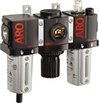 Filters, regulators, lubricators, and piggybacks can be combined together to form combinations. They are typically strung together in the F+R+L arrangement (three-piece combo) and F/R+L (two-piece combo) arrangement, although other configurations are also used depending on application needs. ARO-Flo combination FRLs are easily assembled using modular spacer kits.